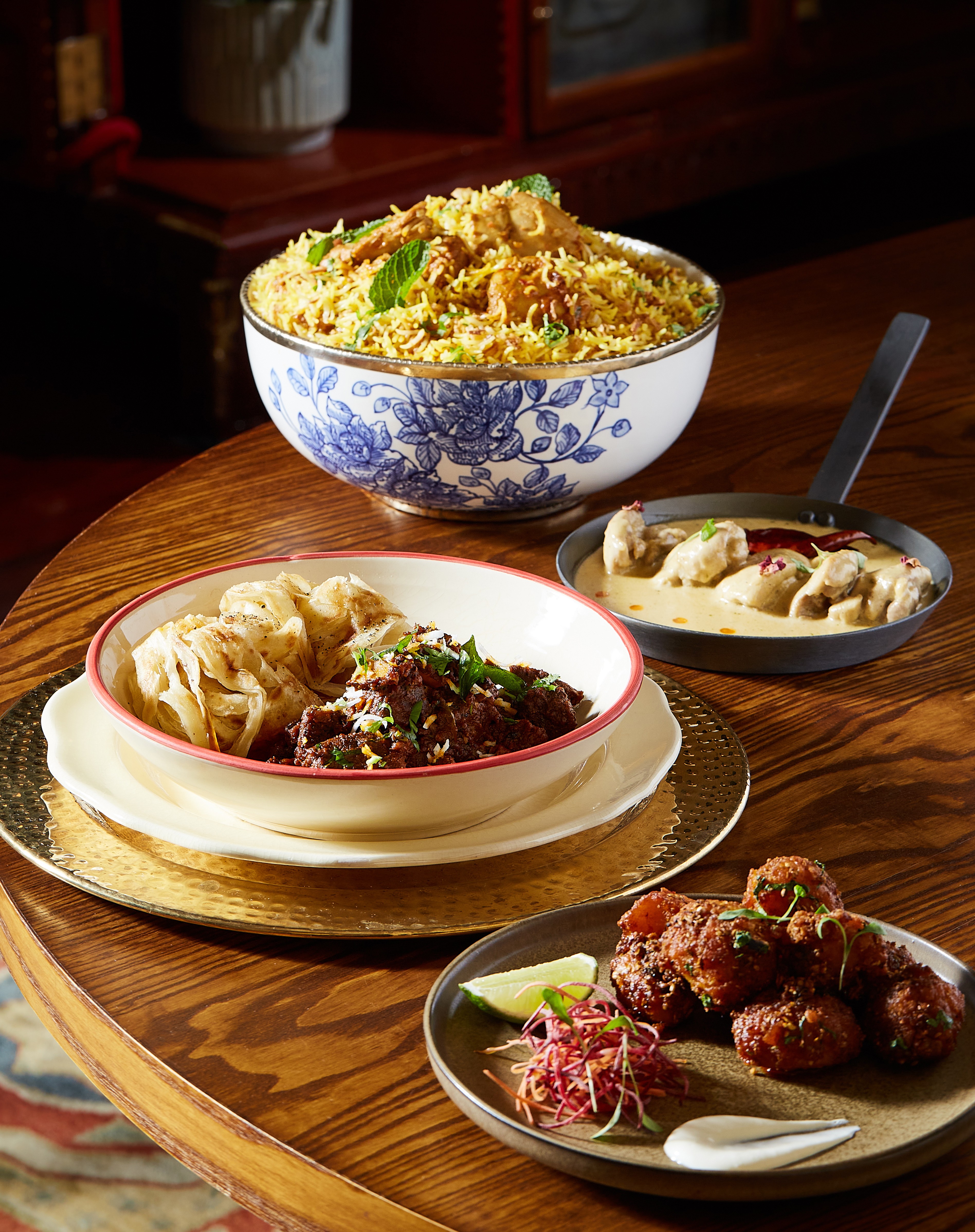 A Beef Pepper Fry, inspired by Kerala’s backwaters, spiked with Tellicherry black pepper and coconut. Kolhapuri Lamb Chops, marinated overnight, tender and perfumed with chili.
